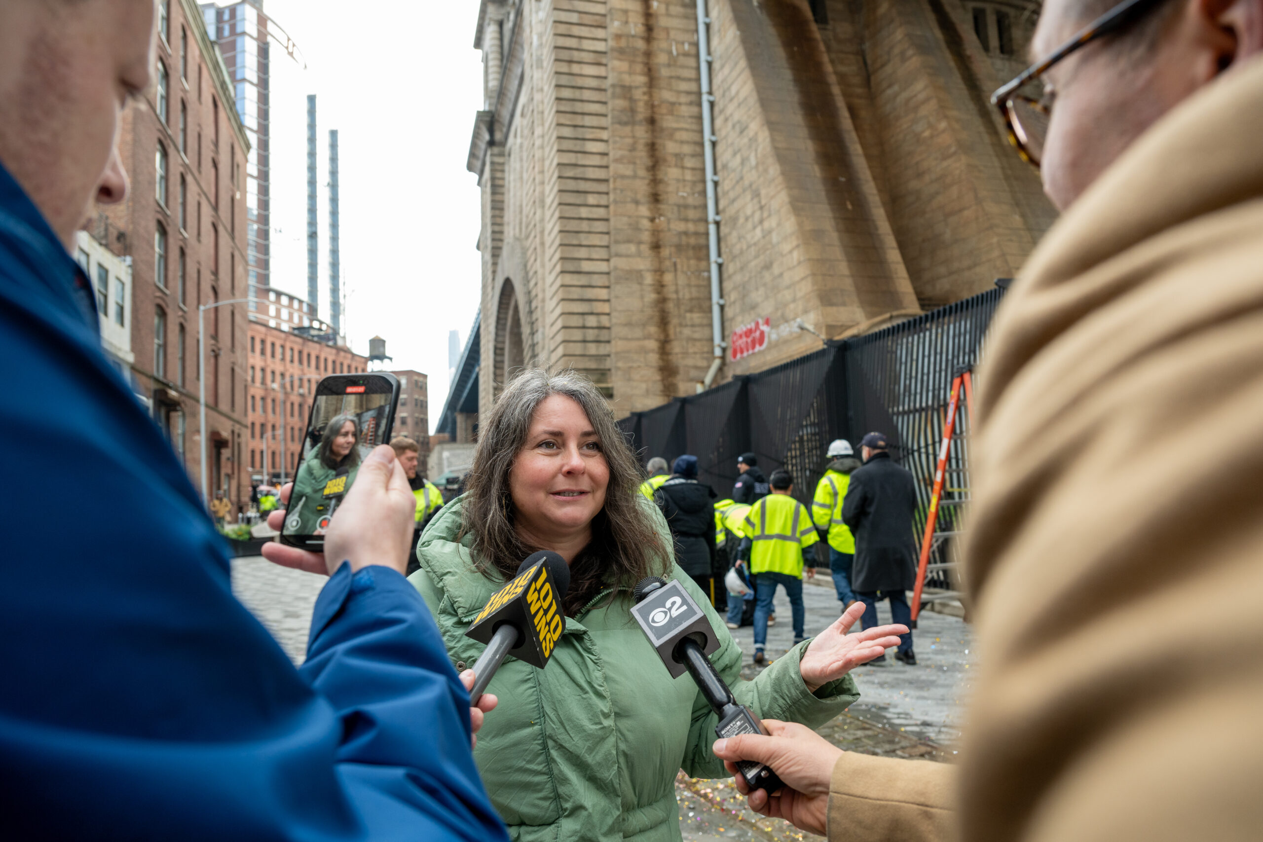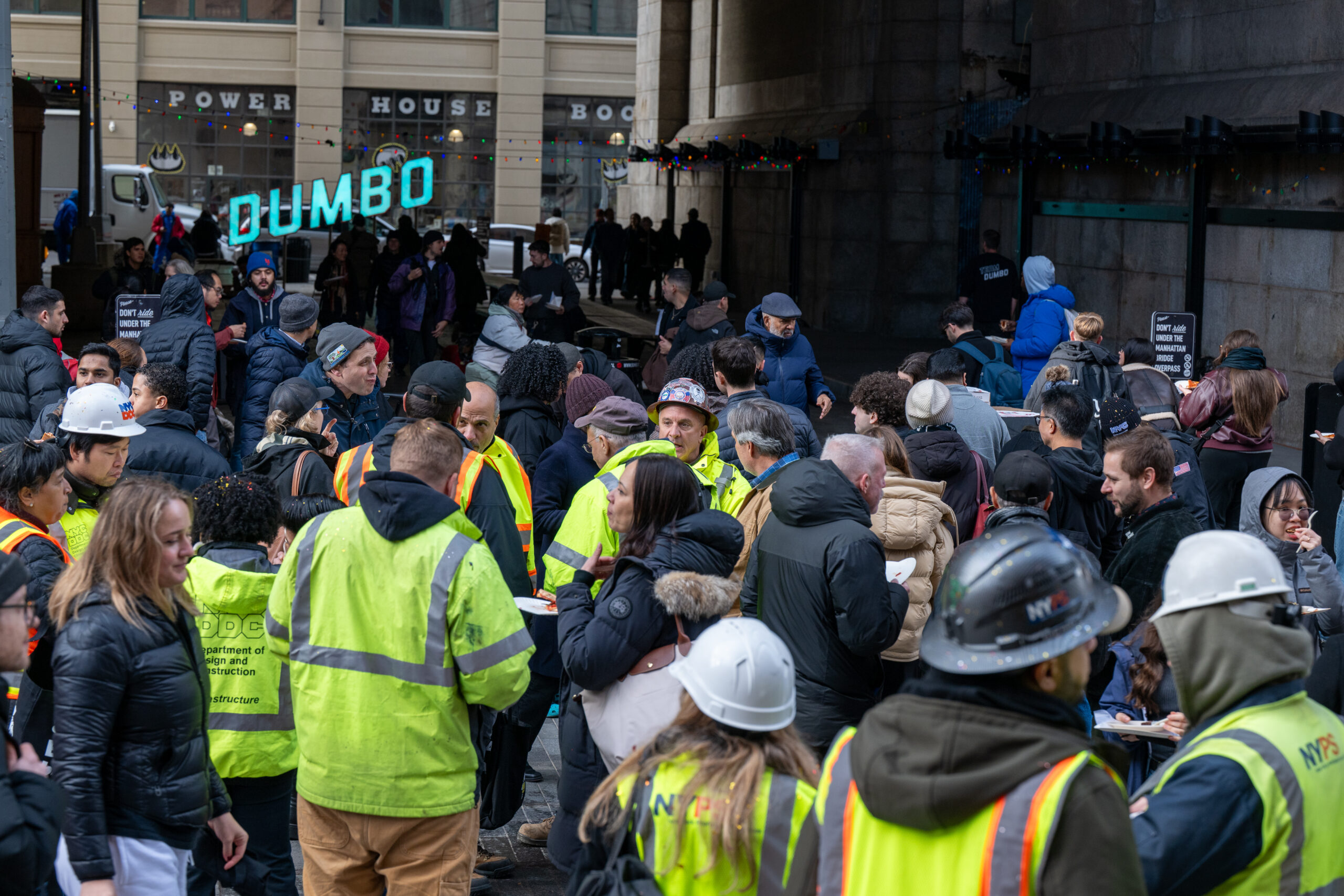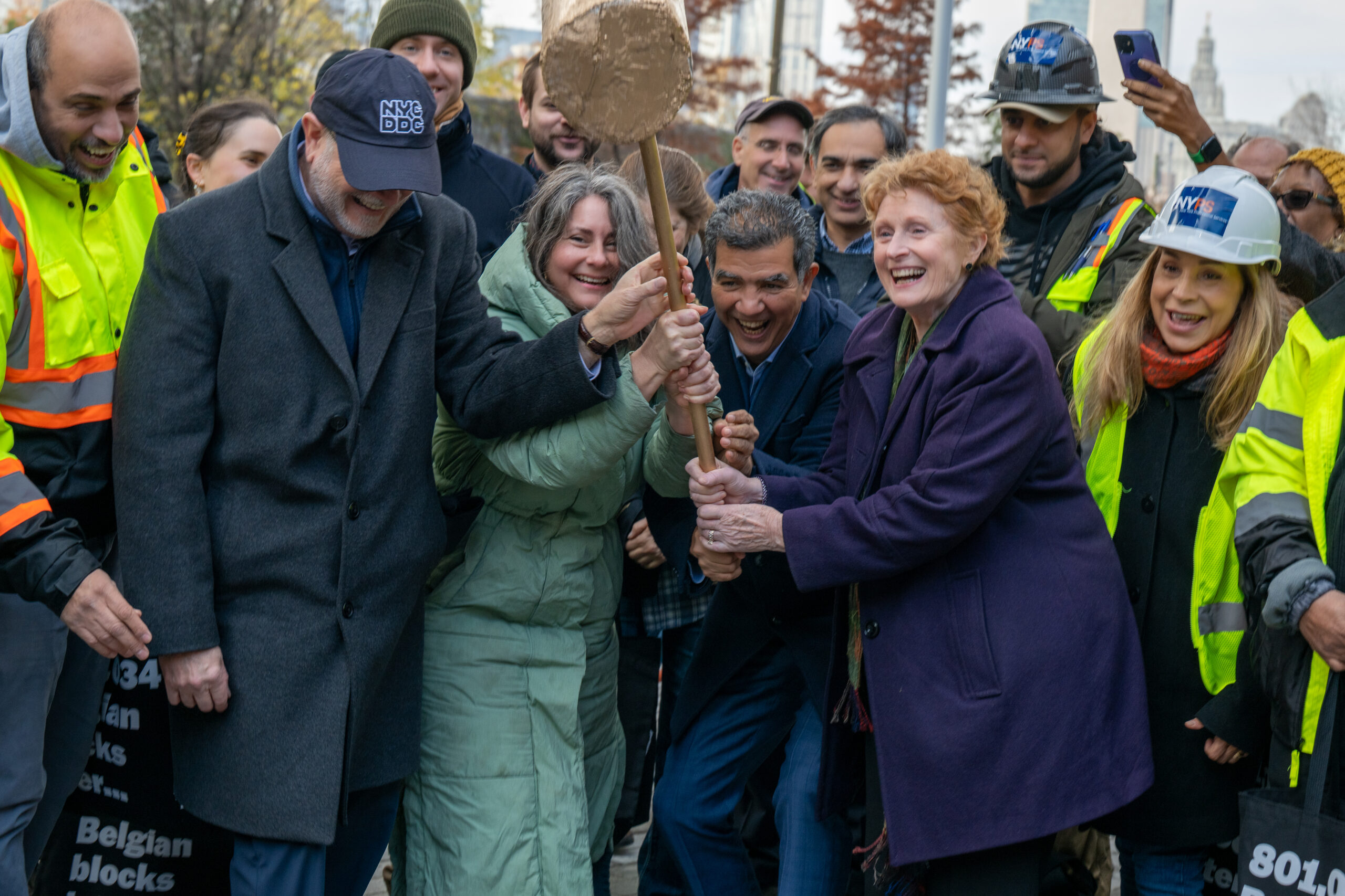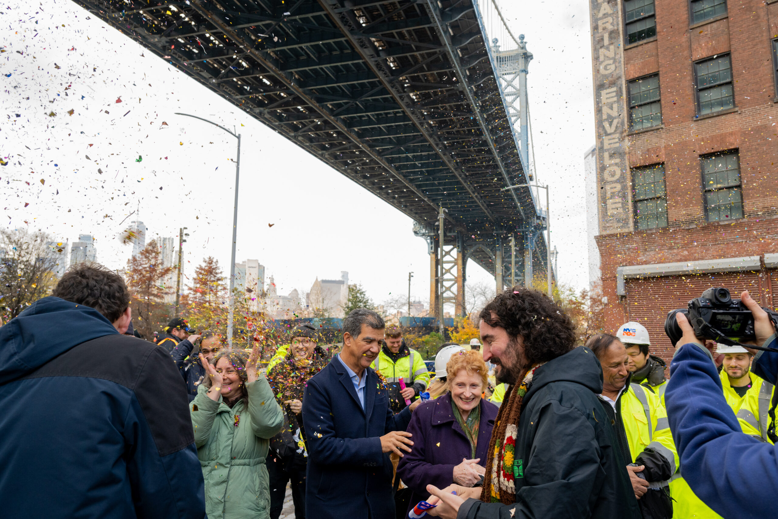 On November 19, 2025, the community gathered to makr this major milestone. More than 400 Dumbonians came out to celebrate the end of construction this week. We screamed, popped confetti and enjoyed Belgian block-shaped cakes from Dawn’s til Dusk, pizza from Ignazios & Front Street Pizza, and tunes by Cara Lee Sparry. And a special thanks to NYC DOT, NYC DDC, Councilmember Restler, and Two TreesNY for making this all happen!