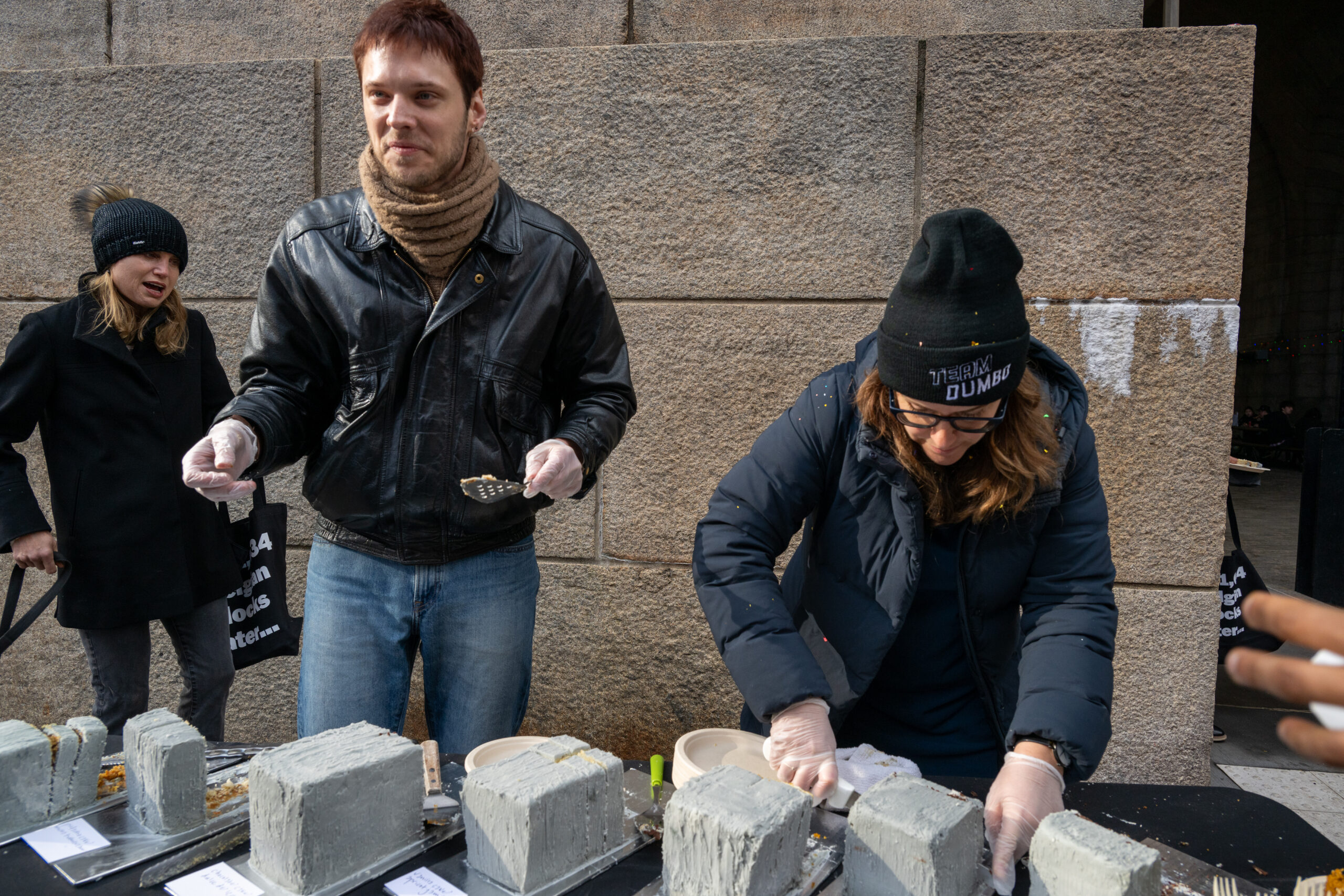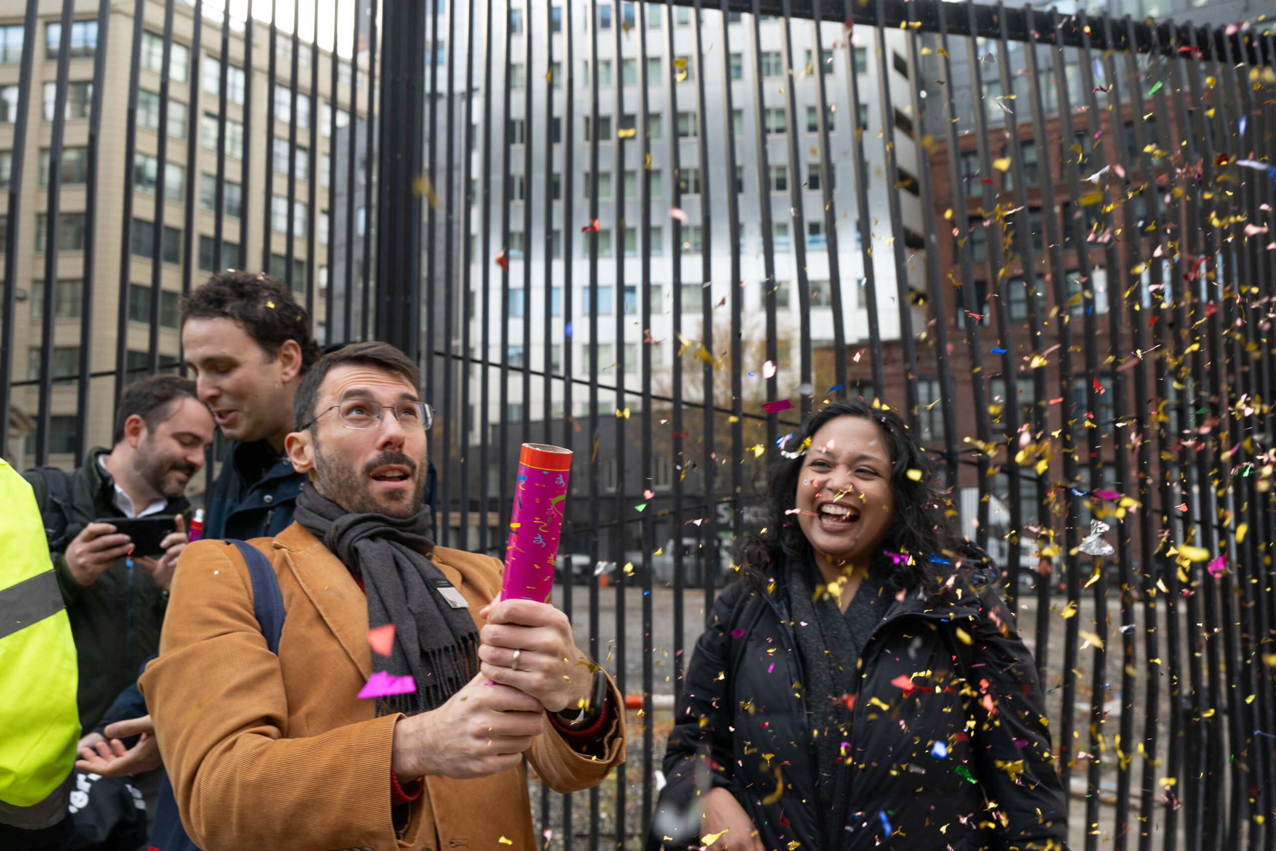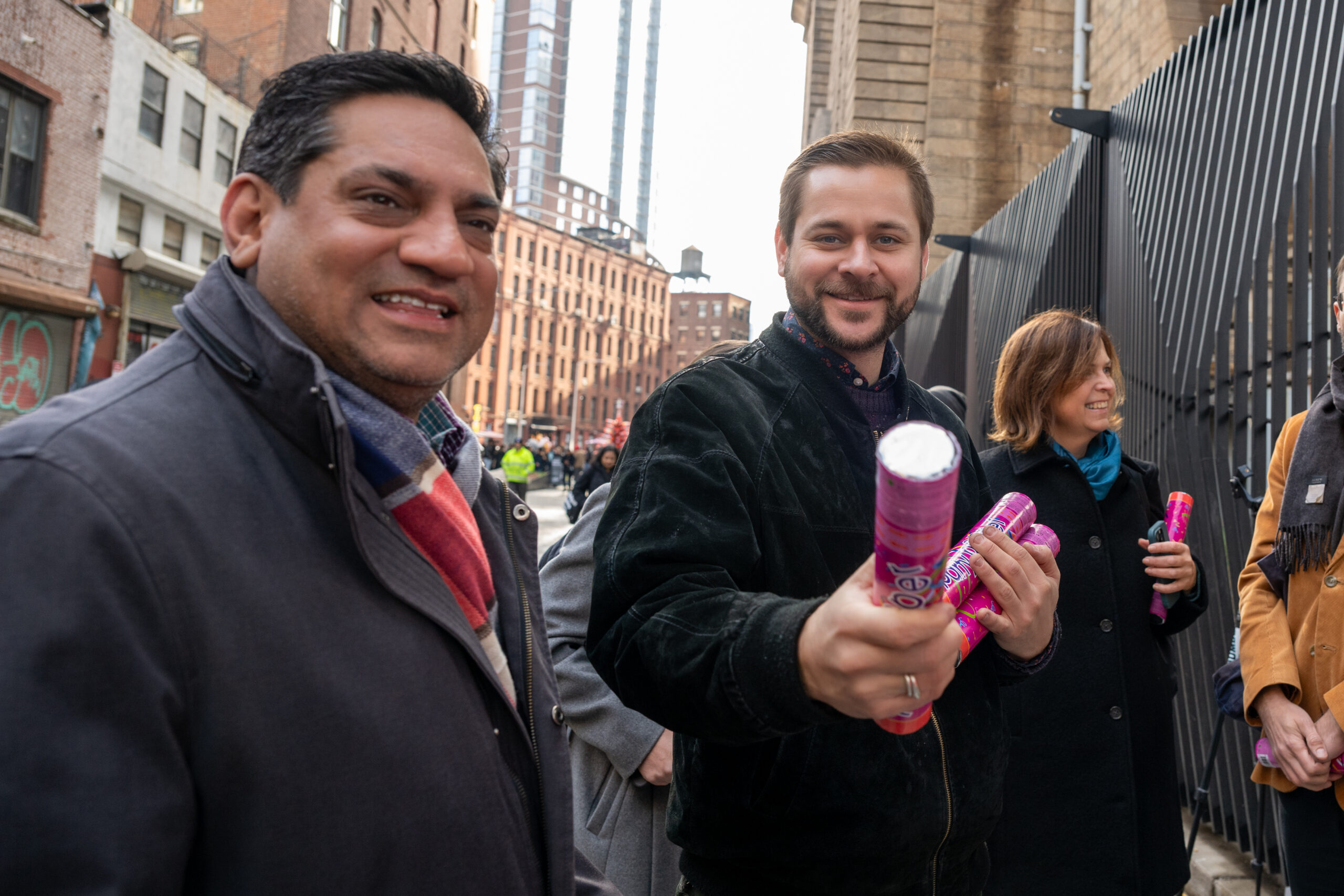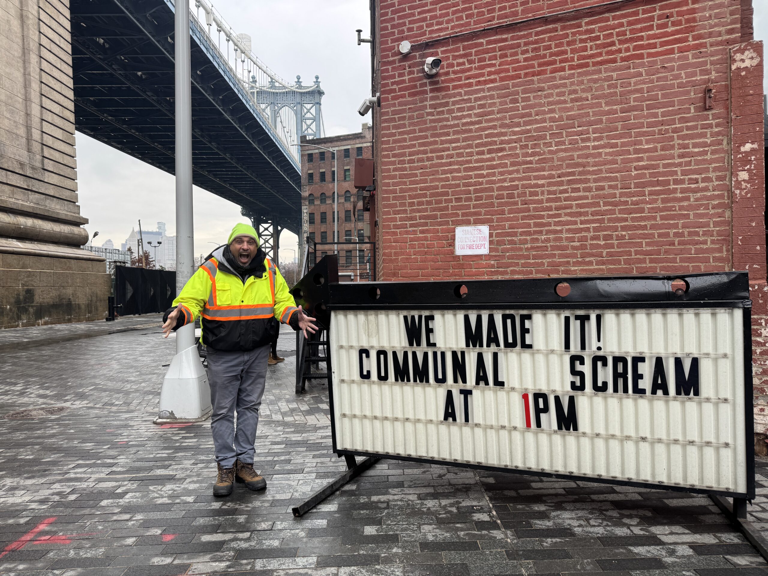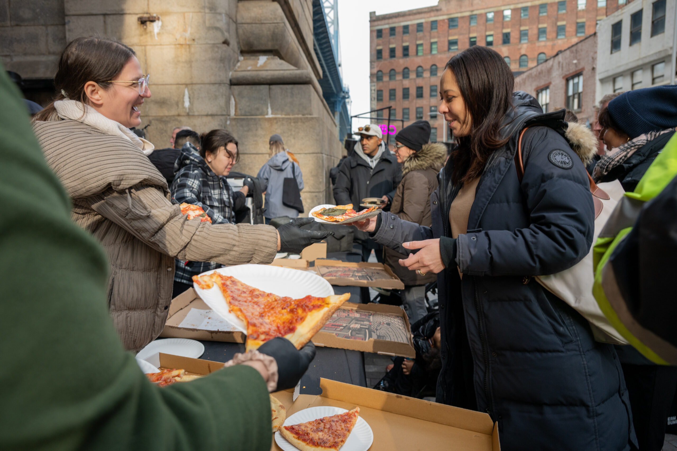 On November 19, 2025, the community gathered to makr this major milestone. More than 400 Dumbonians came out to celebrate the end of construction this week. We screamed, popped confetti and enjoyed Belgian block-shaped cakes from Dawn’s til Dusk, pizza from Ignazios & Front Street Pizza, and tunes by Cara Lee Sparry. And a special thanks to NYC DOT, NYC DDC, Councilmember Restler, and Two TreesNY for making this all happen!