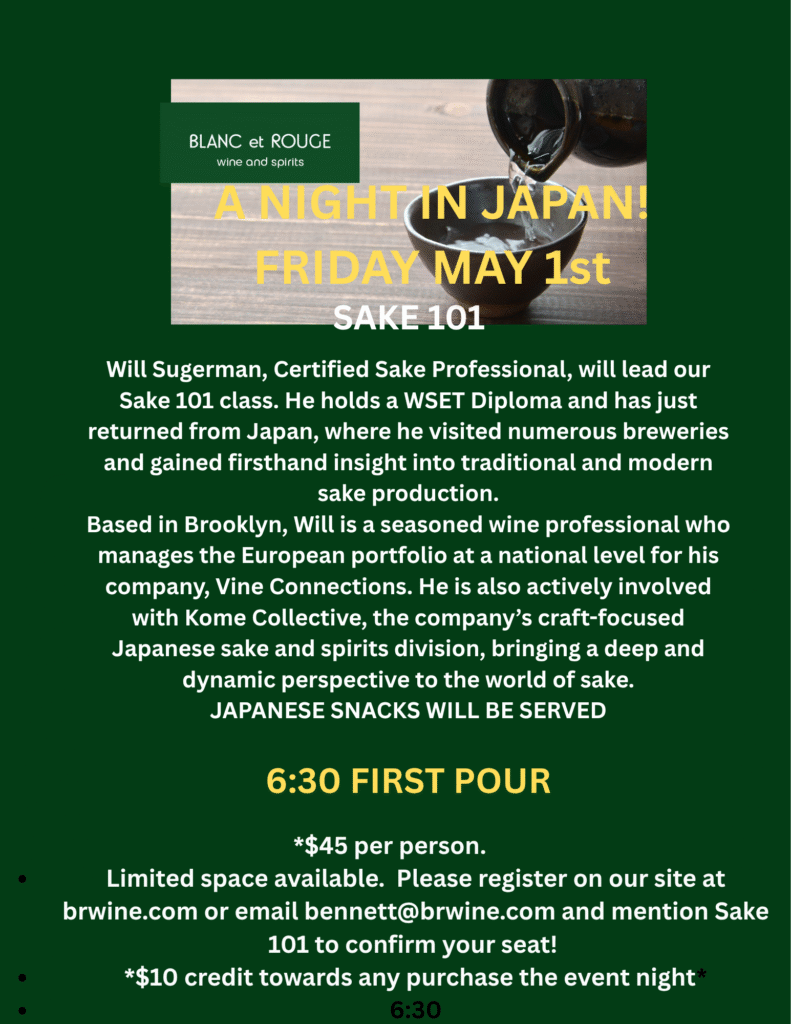 Will Sugerman, Certified Sake Professional, will lead a Sake 101 class. He holds a WSET Diploma and has just returned from Japan, where he visited numerous breweries and gained firsthand insight into traditional and modern sake production.