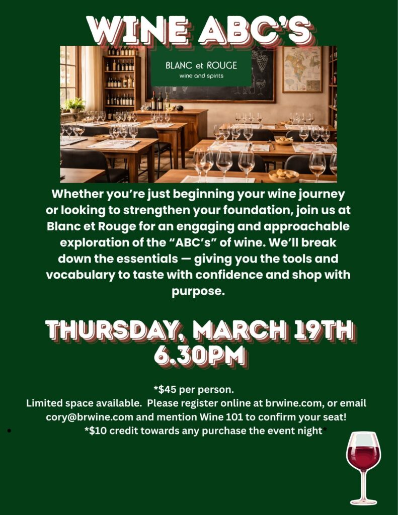 Whether you’re just beginning your wine journey or looking to strengthen your foundation, join Blanc et Rouge for an engaging and approachable exploration of the “ABC’s” of wine. They’ll break down the essentials — giving you the tools and vocabulary to taste with confidence and shop with purpose.