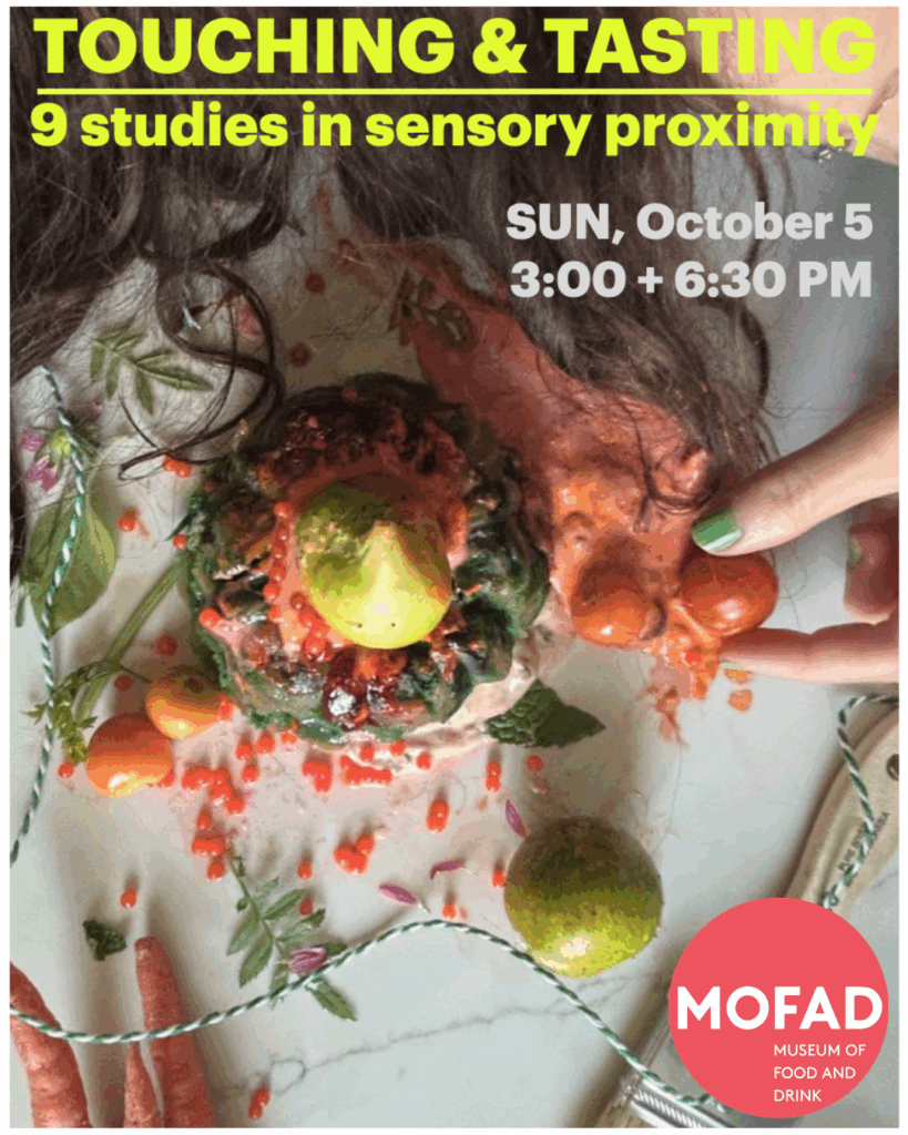 Touching & Tasting: 9 Studies in Sensory Proximity is a multi-sensory performance that explores the intimate connection between flavor, texture, and human experience through interactive encounters. Created for the Museum of Food and Drink (MOFAD), audiences are greeted with individualized personality cocktails followed by controversial salad assembly, improvisational pasta choreography, and other studies in sensory proximity. Explore together explore how embodiment shapes our understanding of attachment, memory, and materiality.