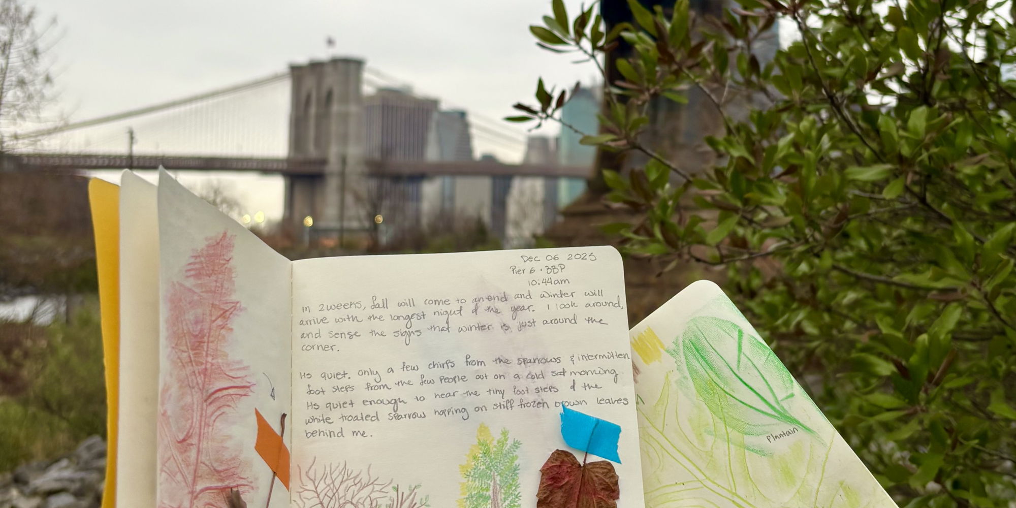 Do you feel like you need a moment of pause and a deeper connection with nature? Join Brooklyn Bridge Park educators on the first Saturday of each month for a free nature journaling workshop. The 90-minute workshop helps you start or expand your nature journaling practice, providing you with ecological context, thematic prompts and time<a href="https://dumbo.nyc/event/nature-journaling-winter-phenology/">Continue reading <span class="sr-only">"Nature Journaling: Winter Phenology"</span></a>