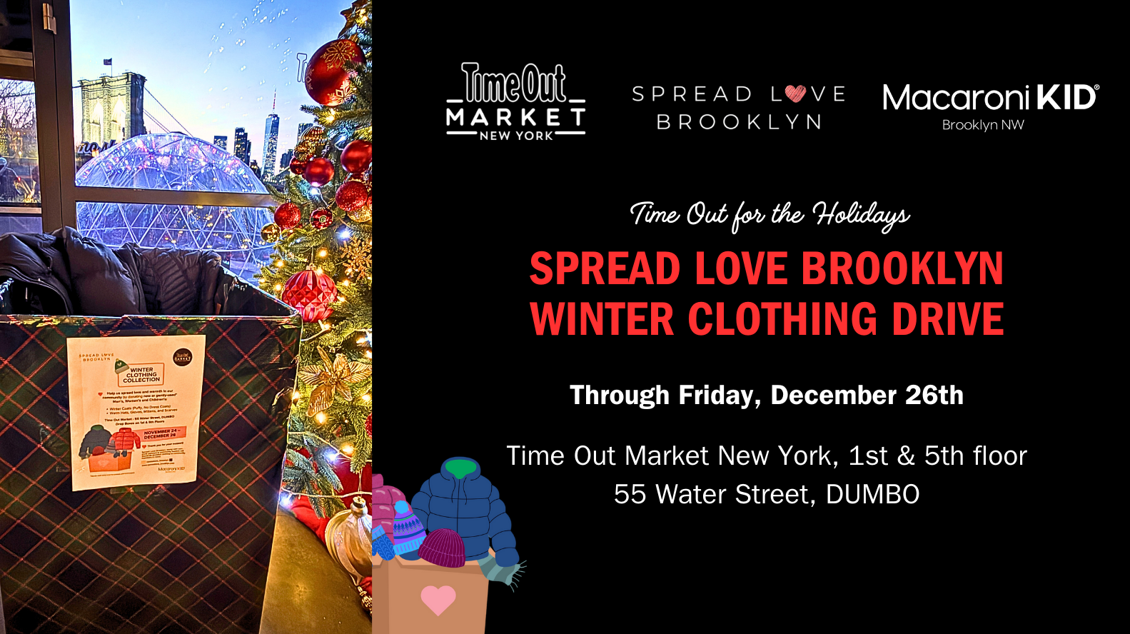 Help spread love and warmth in our community! Kindly drop off your new or gently-used* winter coats and accessories for neighbors in need to designated drop boxes at Time Out Market NY on the 1st and 5th floor. They are looking for Winter jackets (puffy, no dress coats), hats, gloves, mittens, and scarves for all<a href="https://dumbo.nyc/event/spread-love-brooklyn-winter-clothing-drive-at-time-out-market/">Continue reading <span class="sr-only">"Spread Love Brooklyn: Winter Clothing Drive at Time Out Market"</span></a>