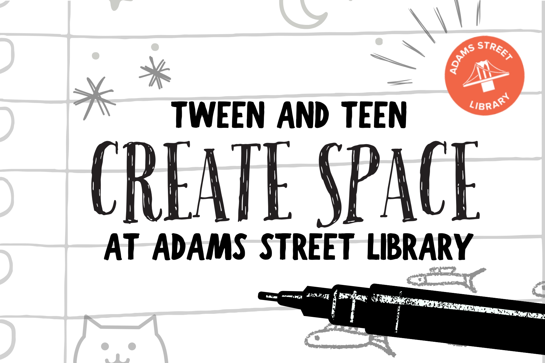 Tweens and teens can visit the Adams Street Library Teen Space to take a break and get creative with our art and writing materials. Grades 4-12. No registration required.