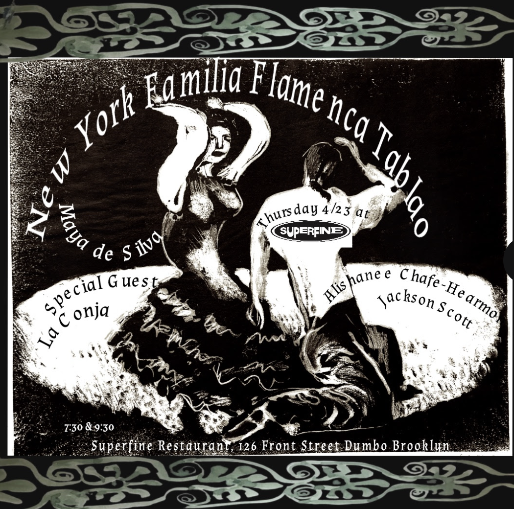 Superfine 126 Front Street, BrooklynSpring is flinging, and so is Superfine! The world-renowned flamenco-dancing BFF Maya da Silva will be back home on the Superfine stage for two live sets this Thursday — and this time she'll be joined by her super-talented daughter, Alishanee Chafe-Hearmon, for the official world premiere of their incredible mother-daughter flamenco duet! Email superfinereservations@gmail.com toContinue reading "Live Flamenco on the Superfine Stage!"