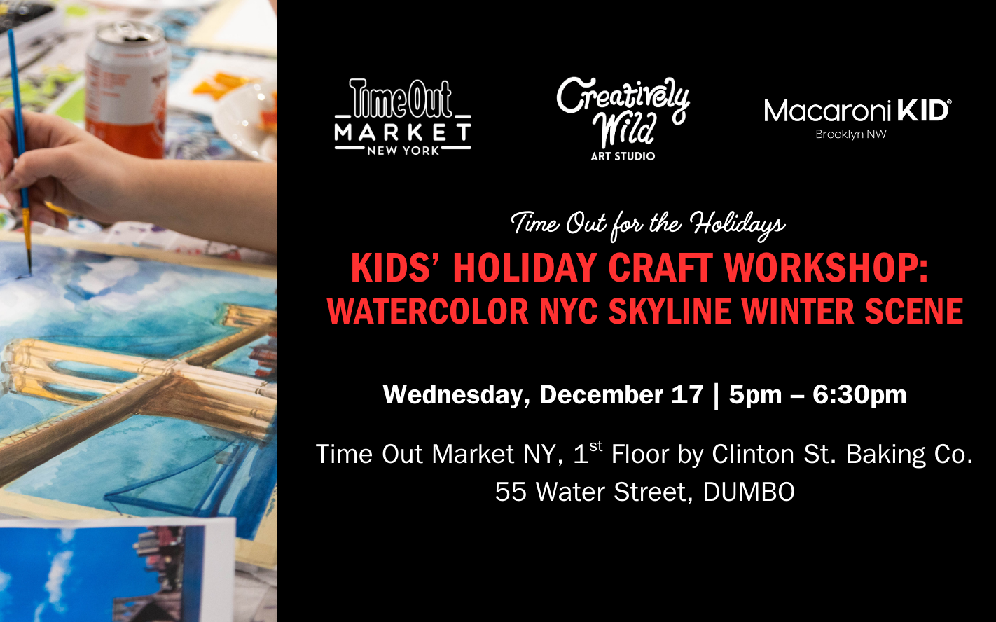Time Out Market 55 Water St, Brooklyn, United StatesBring your family to paint a holiday-inspired NYC winter scene, featuring the Manhattan and Brooklyn Bridges, snow-dusted rooftops, and festive winter details. Instructors will guide you through watercolor techniques includingContinue reading "Holiday Craft Workshop w/ Creatively Wild Art Studio at Time Out Market: Watercolor NYC Skyline Winter Scene"