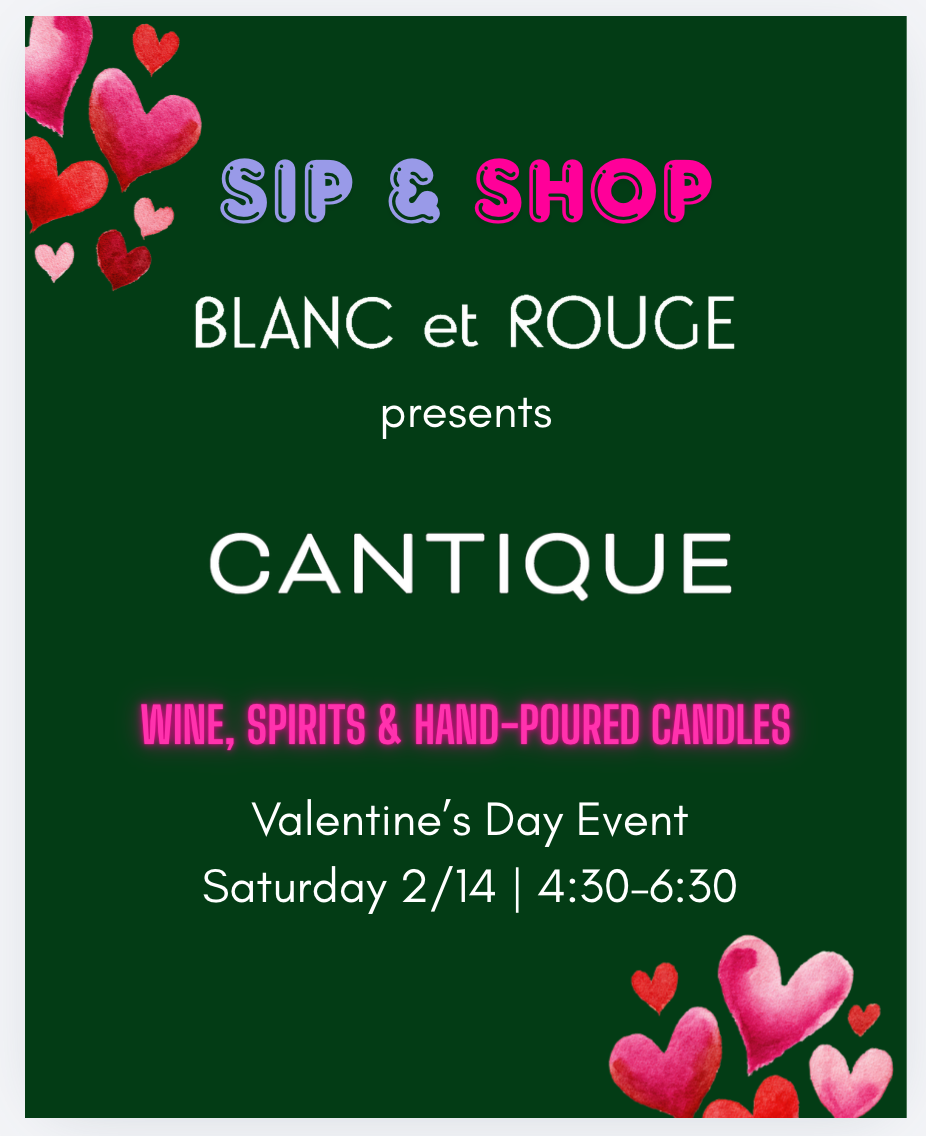 Come to Blanc et Rouge on Saturday, February 14th (pre-dinner resies!), to have a cocktail and shop beautiful candles by Cantique.