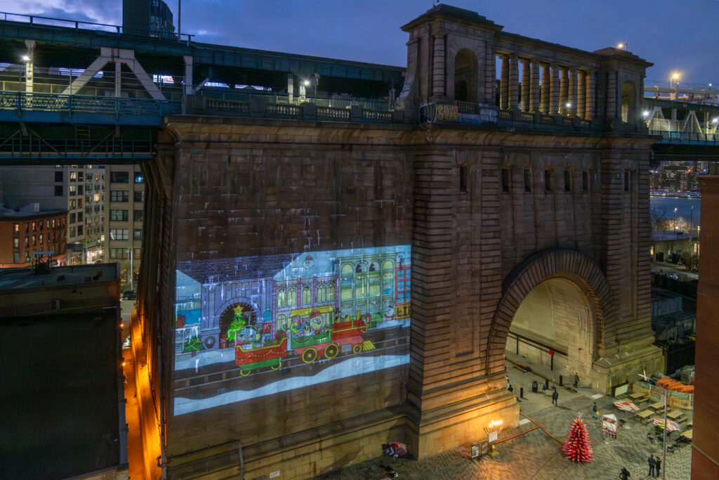Walk around Dumbo and look for holiday themed projections, nightly on the BQE, Manhattan Bridge, building facades and more! As is our tradition, we’ve partnered with Augenblick Studios, an award-winning, independent animation studio here in Dumbo, to create delightful, whimsical and surprising animations for the holiday season.