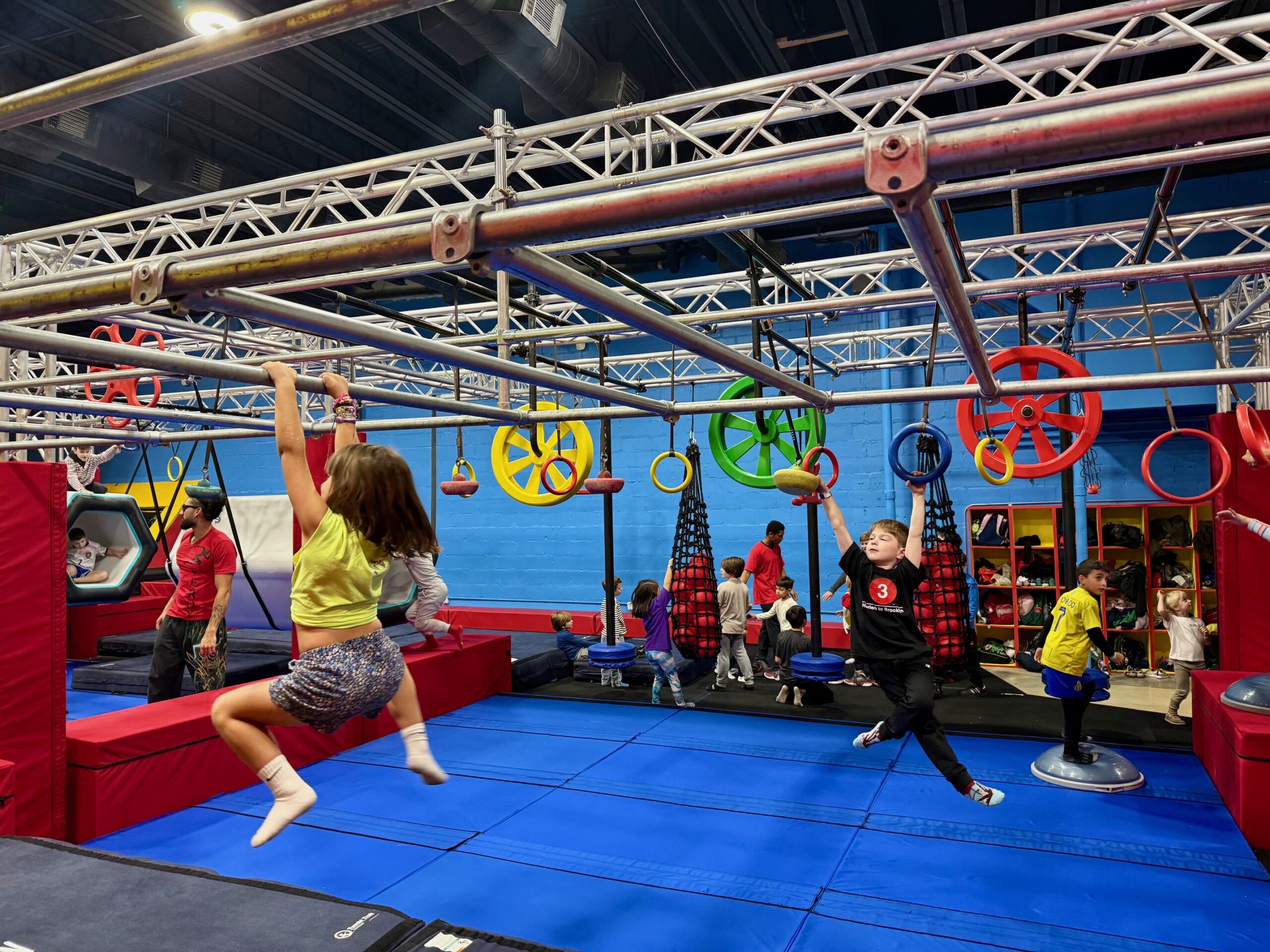 Epic indoor playground with ninja warrior courses, a modular parkour setup designed for people of any skill level and a massive trampoline arena.
