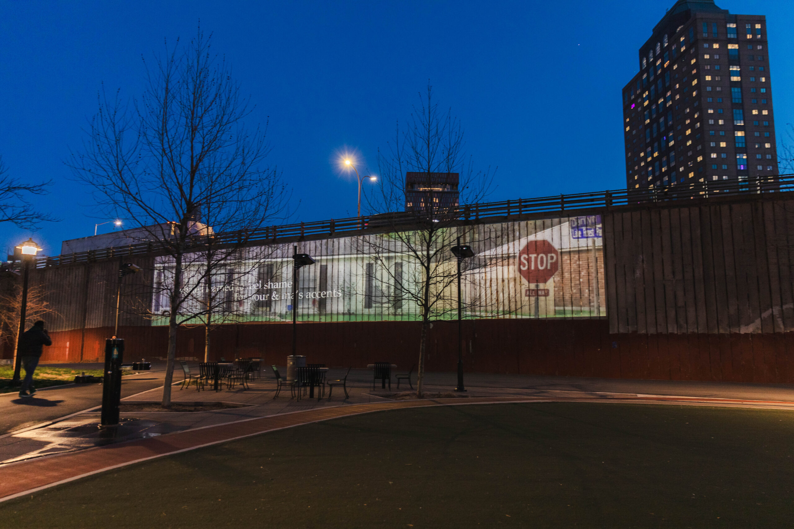 Projected onto the Manhattan Bridge (Plaza side) and onto the BQE Wall in Dr. Susan Smith Park.